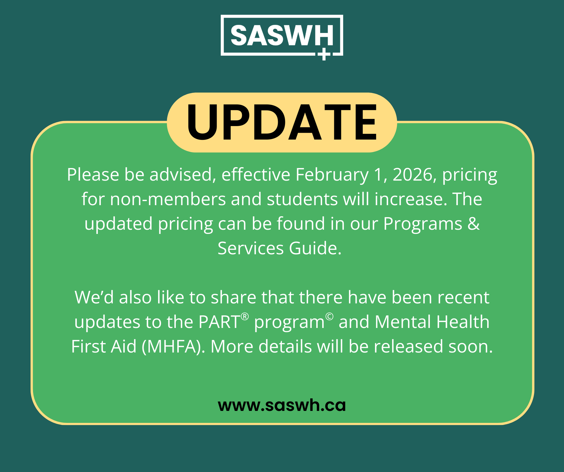 Note: The non-member pricing listed in the Programs and Services Guide is for training located in Saskatchewan. For pricing on training outside of the province, please contact [email protected].